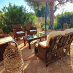 Die Finca liegt sehr ruhig ca. 1 km außerhalb des Dorfes Es Llombards in Richtung Ses Salines am Ende einer Sackgasse. Die Terrasse vor dem Haus ist ruhig und bietet gegen Abend Schatten. Hier kann man den Abend gemeinsam bei einem Barbecue gesellig ausklingen lassen. Im Patio lädt die gemütliche Rattan-Sitzecke zum Chillen bei einem Sundowner aus. Hier hören Sie die Vögelchen singen und die Hasen hoppeln fast an Sie vorbei. Sie befinden sich mitten in der Natur. Diese absolute Ruhe wissen auch die Tiere zu schätzen.