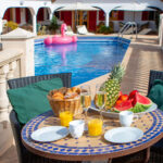 Jedes Apartment verfügt über eine eigene geschützte Terrasse unter der Porche mit Lounge-Ecke und Esstisch. Hier können Sie frühstücken oder auch gemütlich ein Buch lesen. Im Patio in der Mitte gibt es Sonnenliegen zum Relaxen. Und von hier aus gehen Sie die paar Stufen hoch zum Gemeinschaftspool.